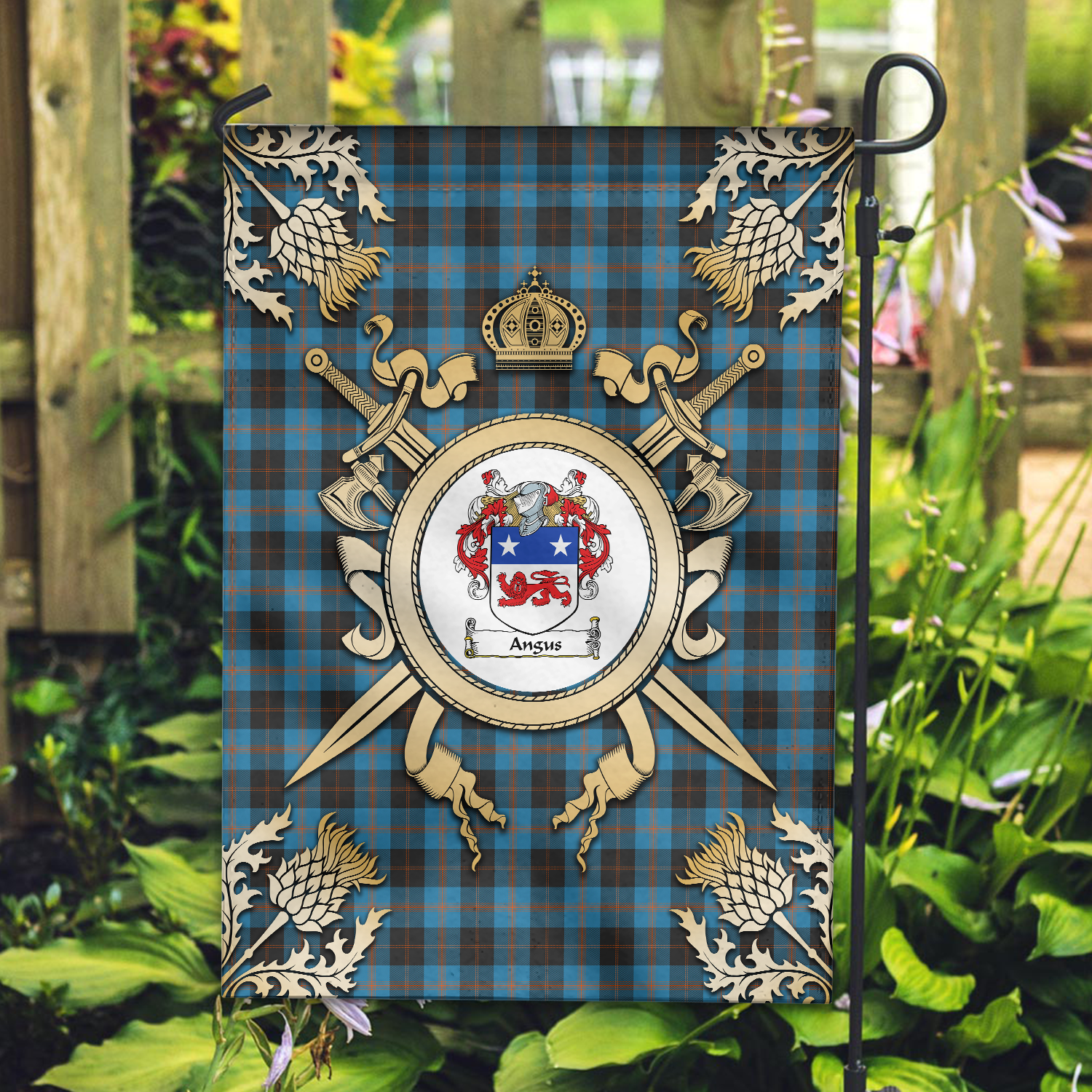 Angus Ancient Tartan Crest Black Garden Flag - Gold Thistle Style