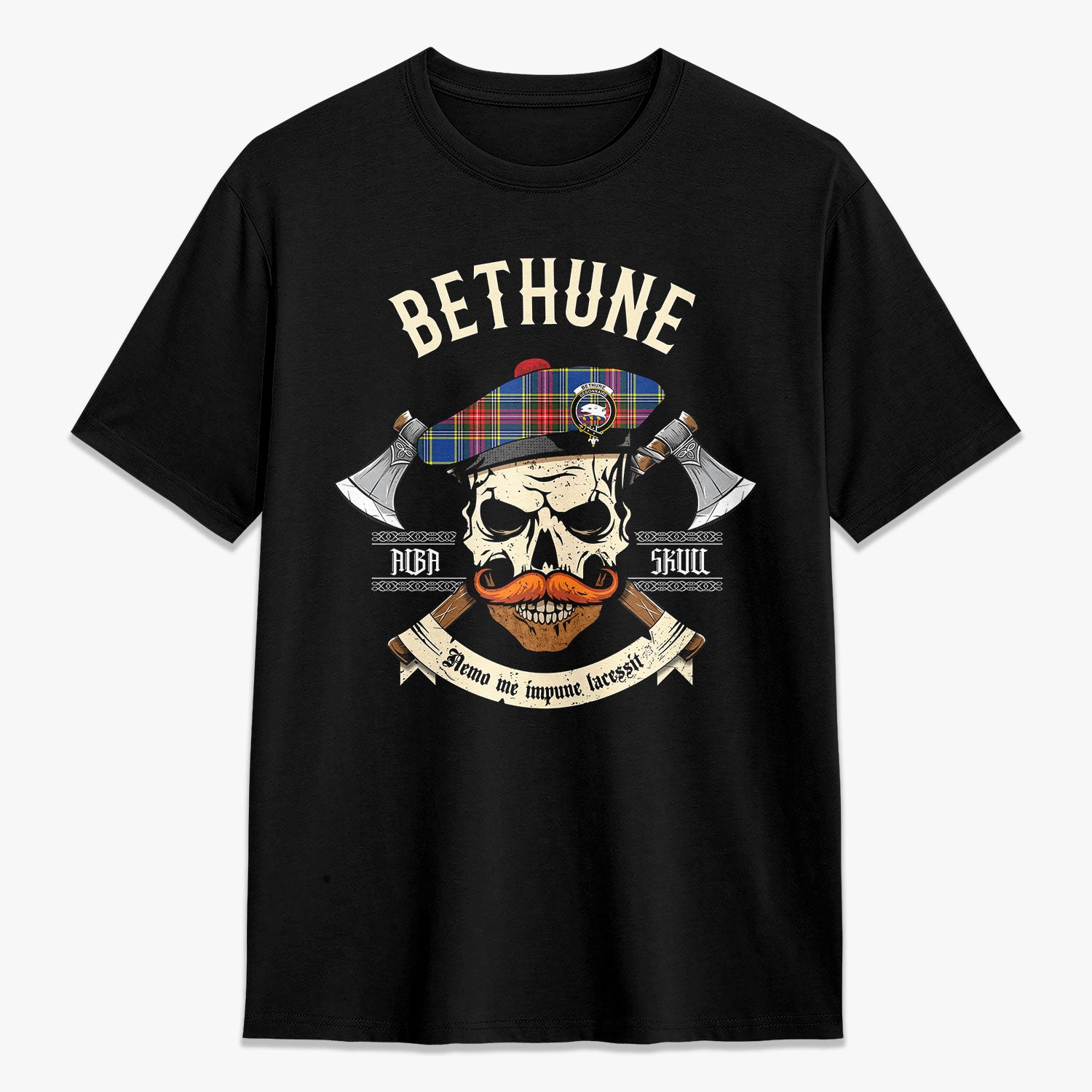 Bethune Modern Tartan Crest 2D T-shirt - Alba Skull Style,