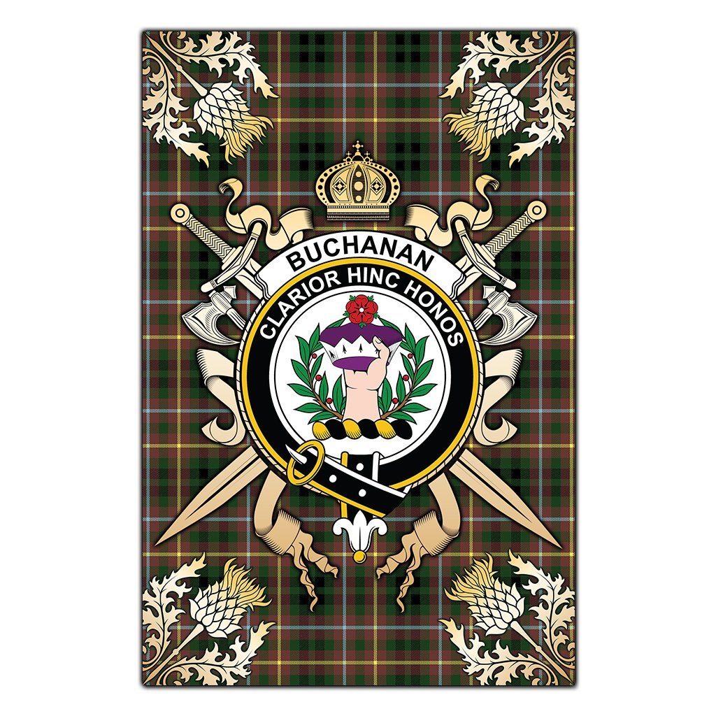 Buchanan Hunting Tartan Crest Black Garden Flag - Gold Thistle Style