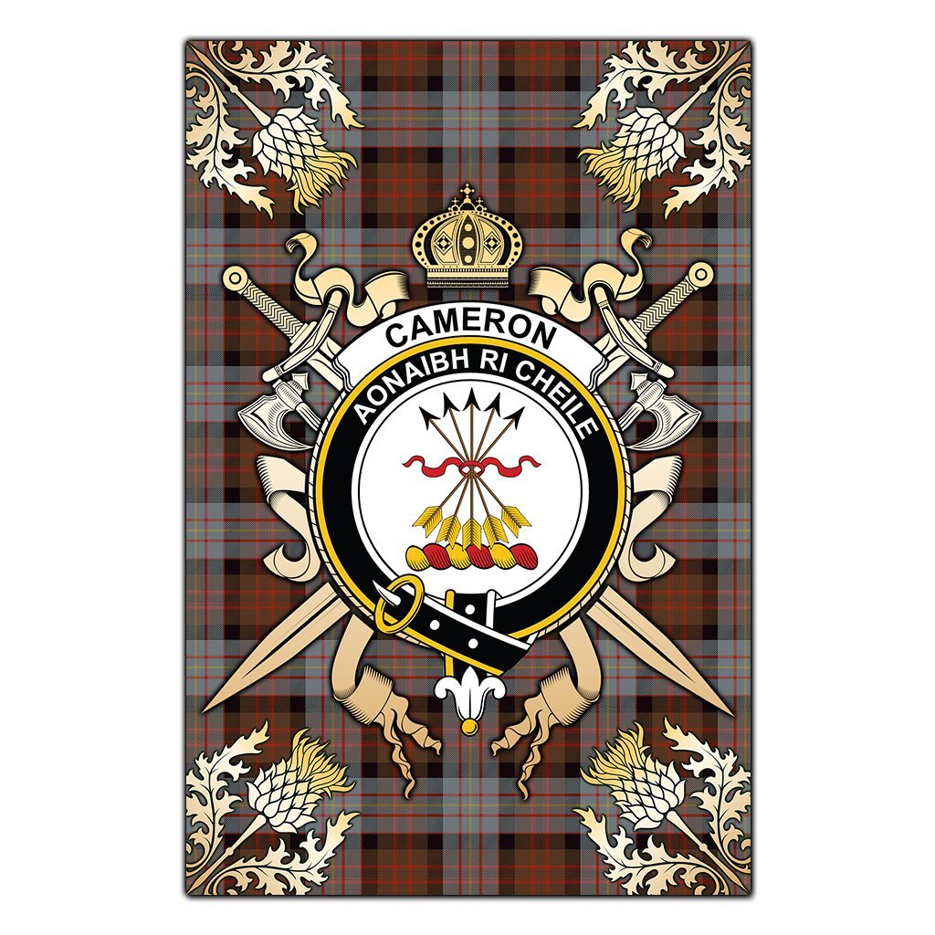 Cameron Of Erracht Weathered Tartan Crest Black Garden Flag - Gold Thistle Style