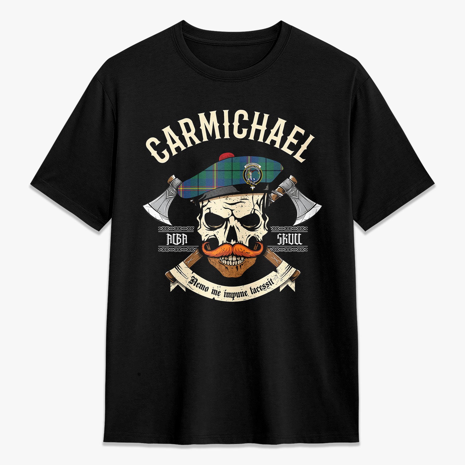 Carmichael Ancient Tartan Crest 2D T-shirt - Alba Skull Style,