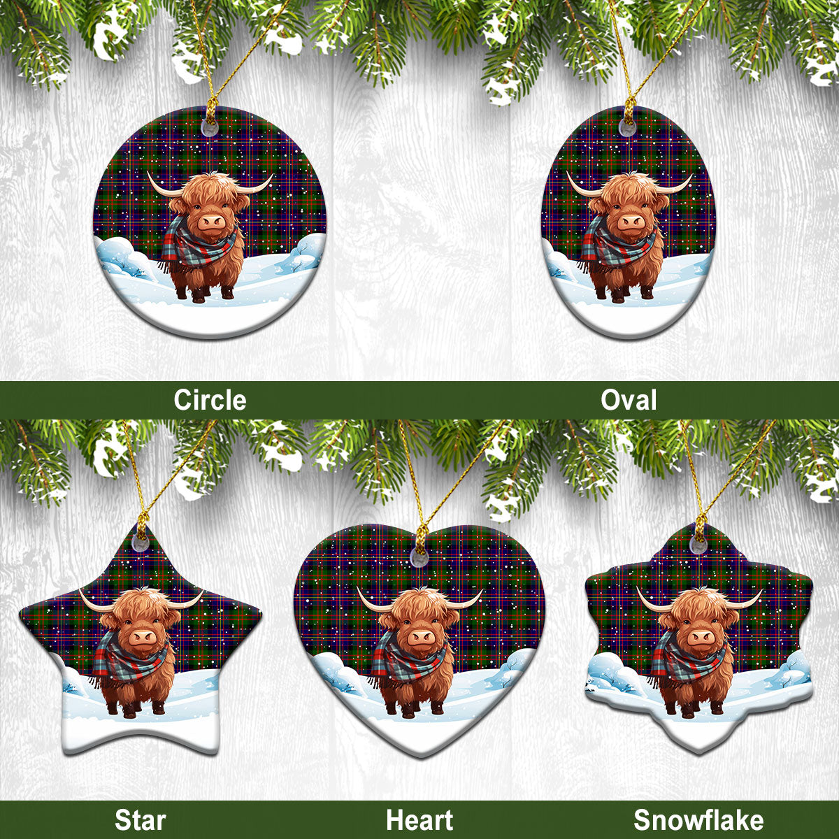 Chalmers Tartan Christmas Ceramic Ornament - Highland Cows Snow Style