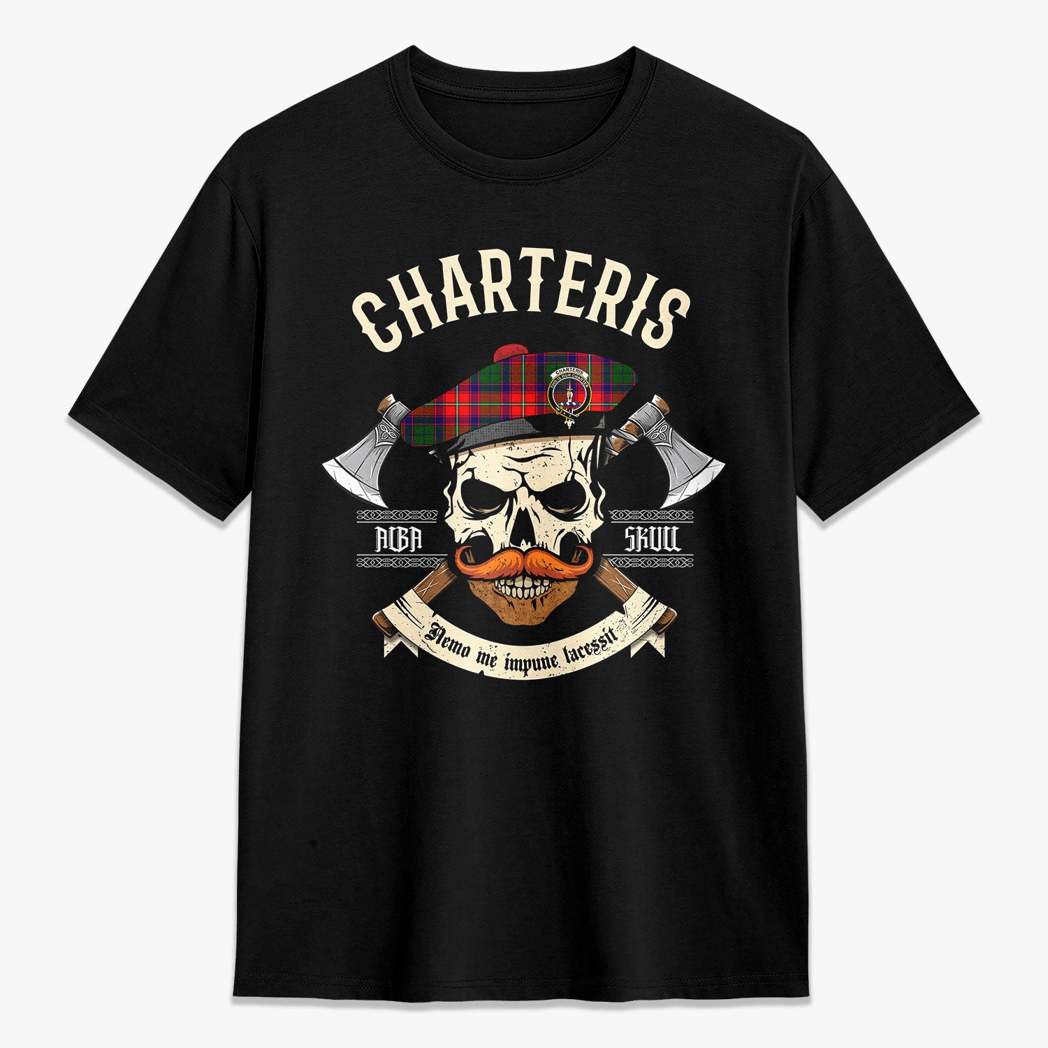 Charteris (Earl of Wemyss) Tartan Crest 2D T-shirt - Alba Skull Style,