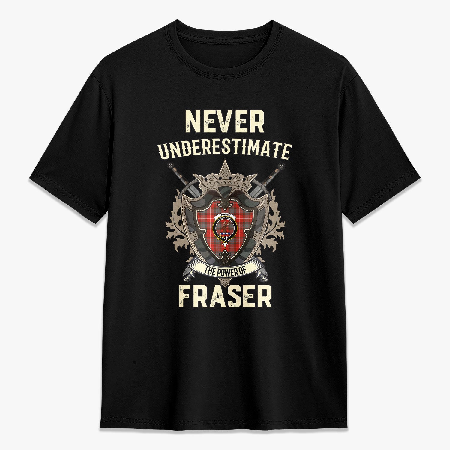 Fraser (of Lovat) Weathered Tartan Crest 2D T-shirt - Never Underestimate Style