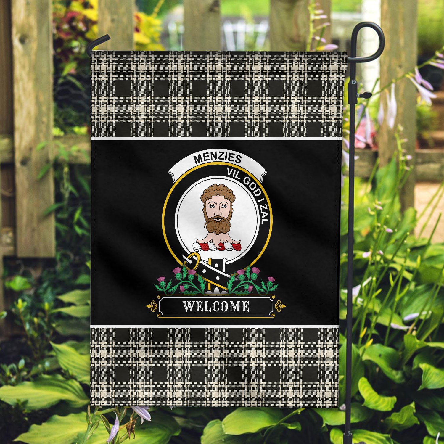 Menzies Black _ White Ancient Tartan Crest Garden Flag - Welcome Style