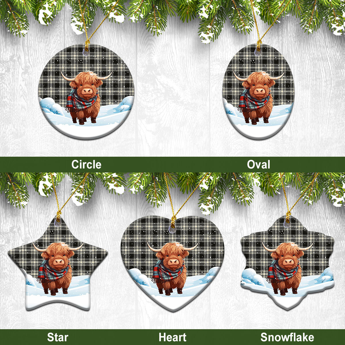 Menzies Black - White Ancient Tartan Christmas Ceramic Ornament - Highland Cows Snow Style