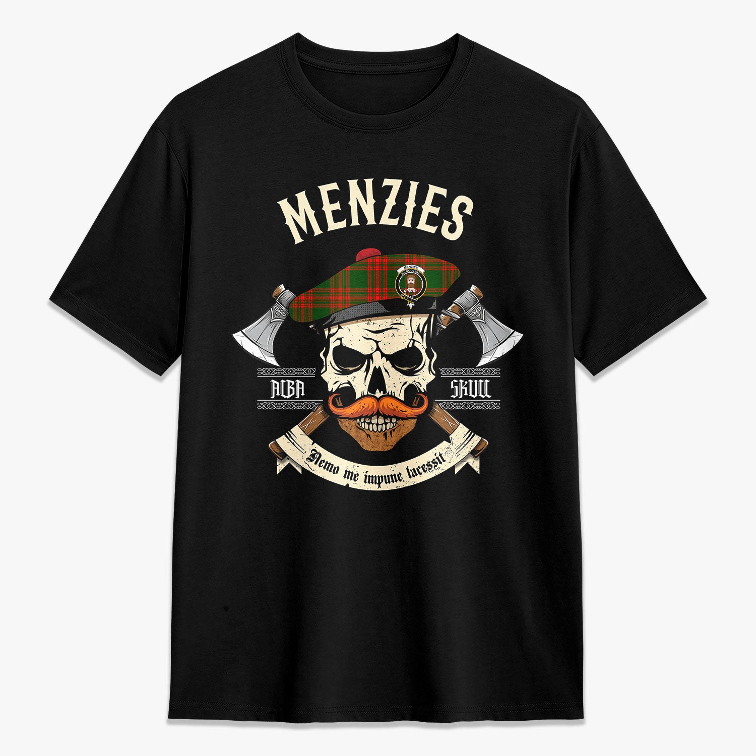 Menzies Green Modern Tartan Crest 2D T-shirt - Alba Skull Style,