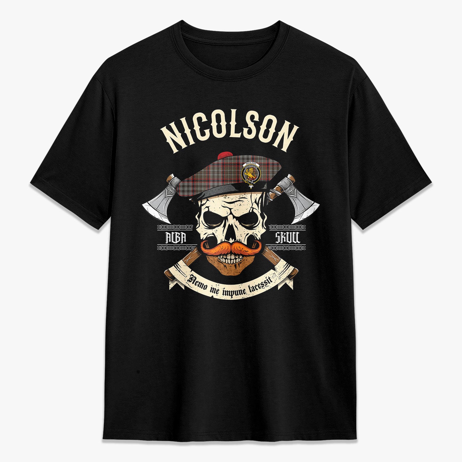 Nicolson Hunting Weathered Tartan Crest 2D T-shirt - Alba Skull Style,