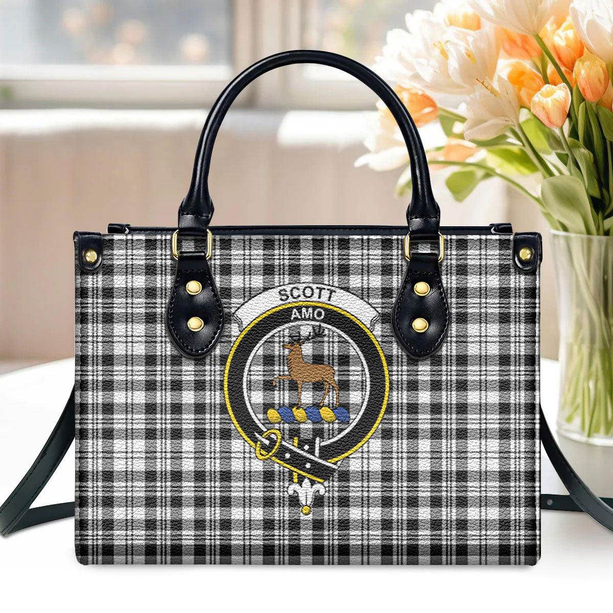 Scott Black & White Modern Tartan Crest Leather Handbag