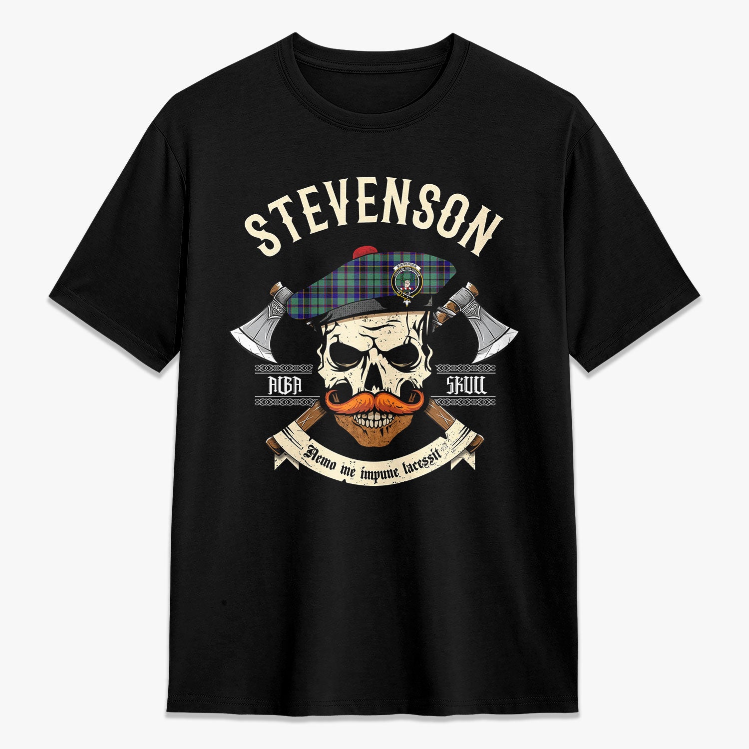 Stevenson Tartan Crest 2D T-shirt - Alba Skull Style,