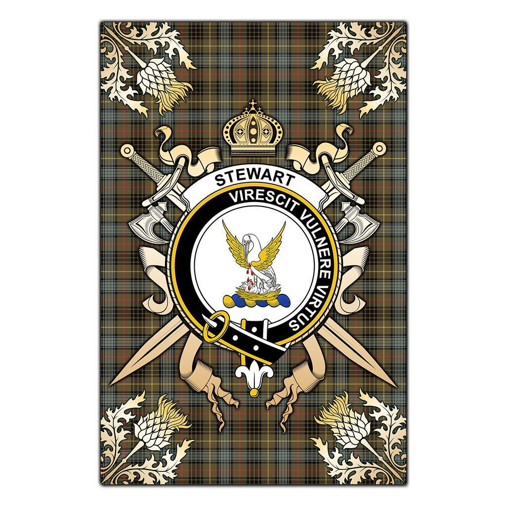 Stewart Hunting Weathered Tartan Crest Black Garden Flag - Gold Thistle Style