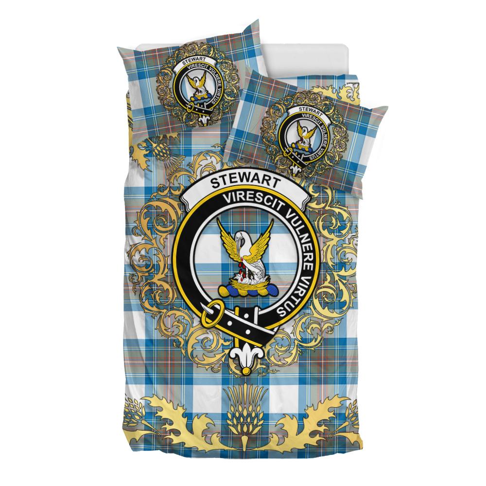 Stewart Muted Blue Tartan Crest Bedding Set - Golden Thistle Style
