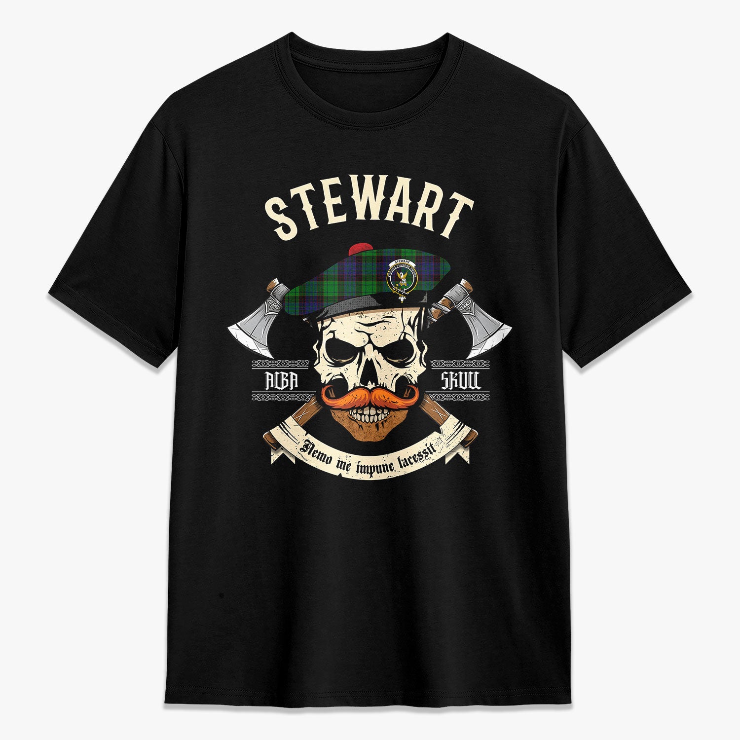 Stewart Old Modern Tartan Crest 2D T-shirt - Alba Skull Style,