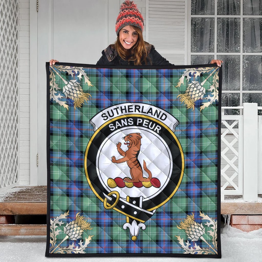Sutherland Old Ancient Tartan Crest Premium Quilt - Gold Thistle Style