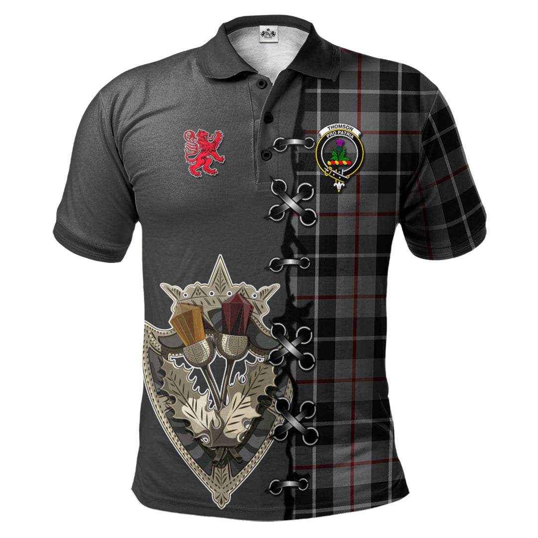 Thompson Grey Tartan Polo Shirt - Lion Rampant And Celtic Thistle Style