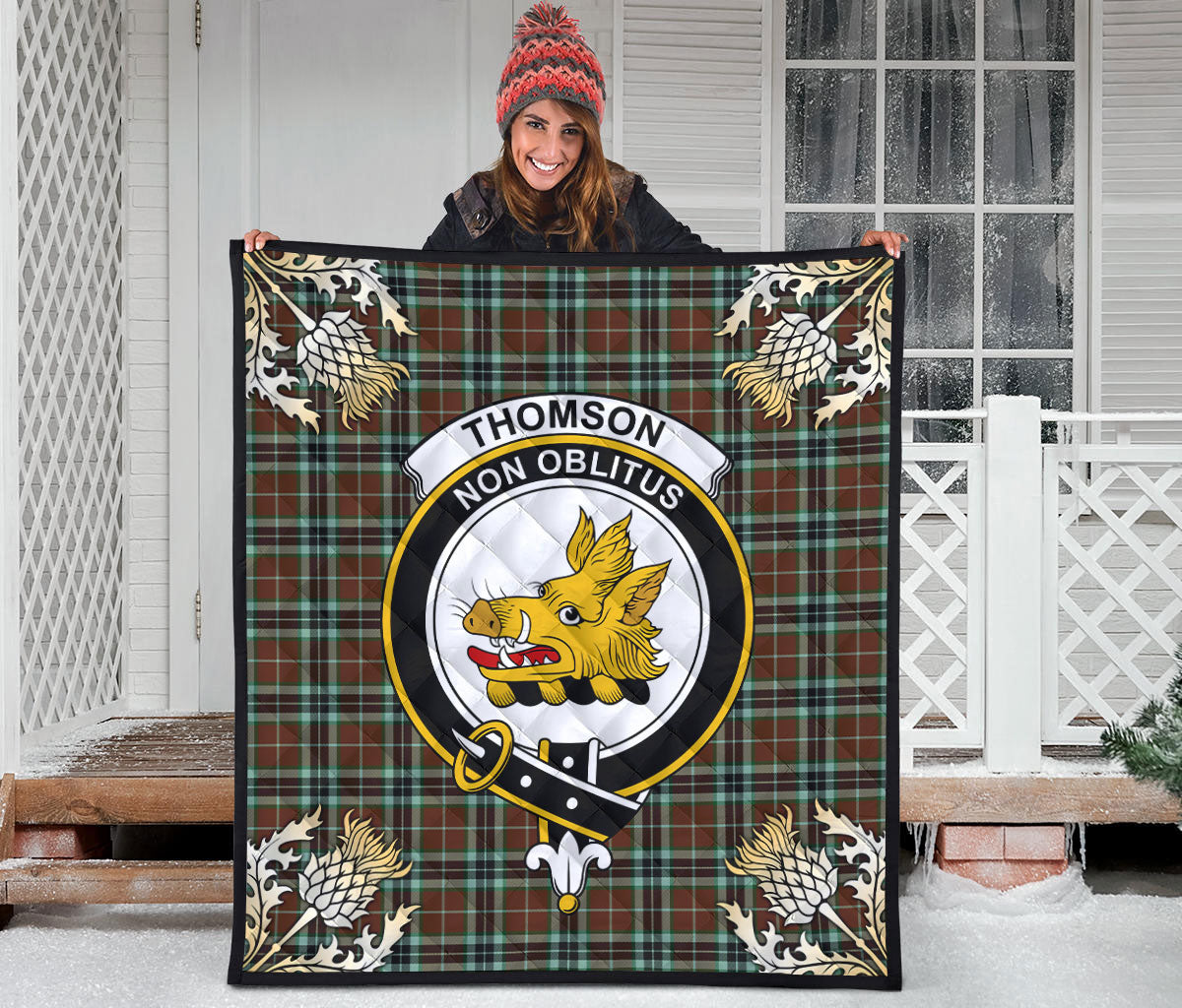 Thomson Hunting Modern Tartan Non Oblitus Crest Premium Quilt - Gold Thistle Style