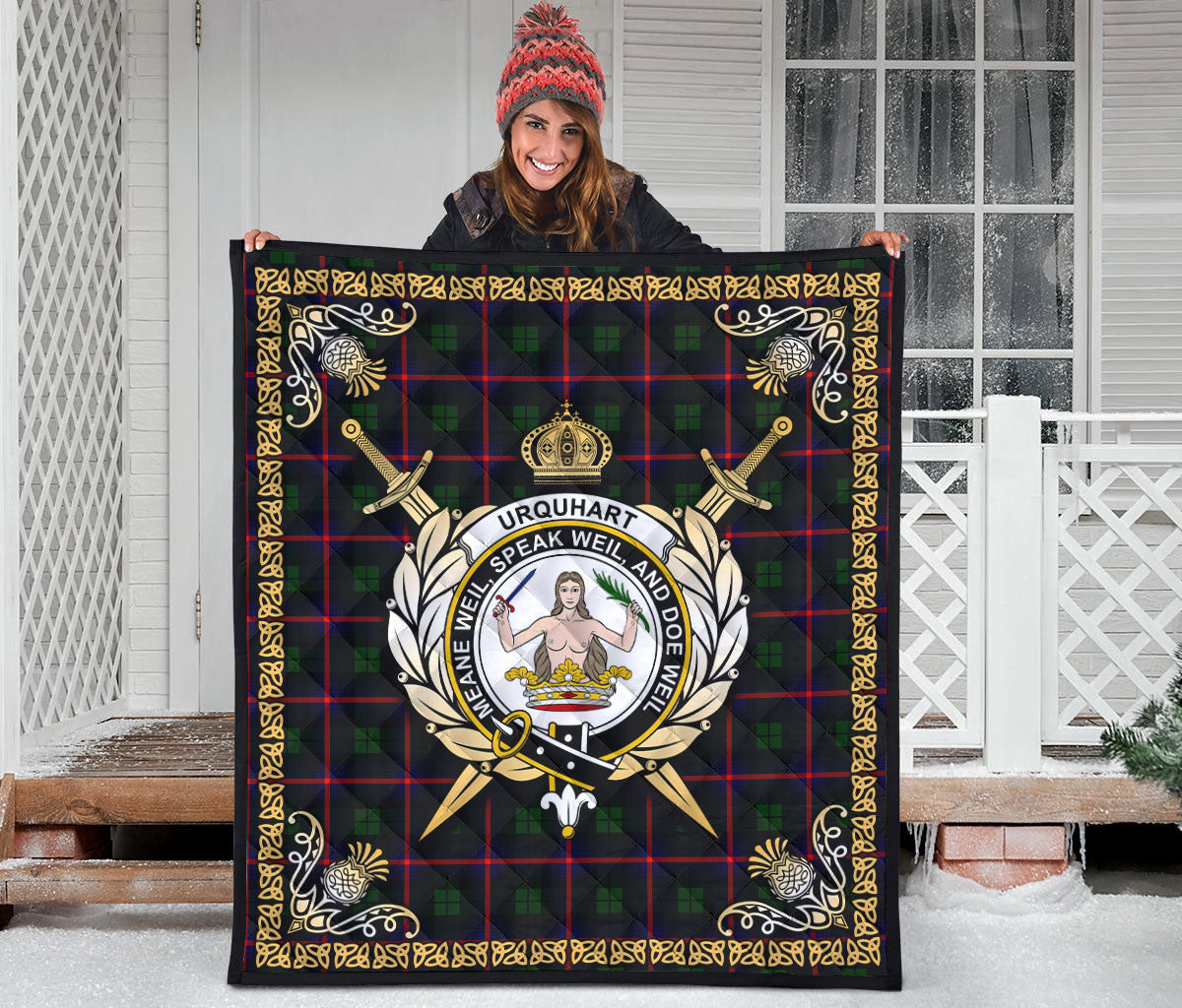 Urquhart Modern Tartan Crest Premium Quilt - Celtic Thistle Style