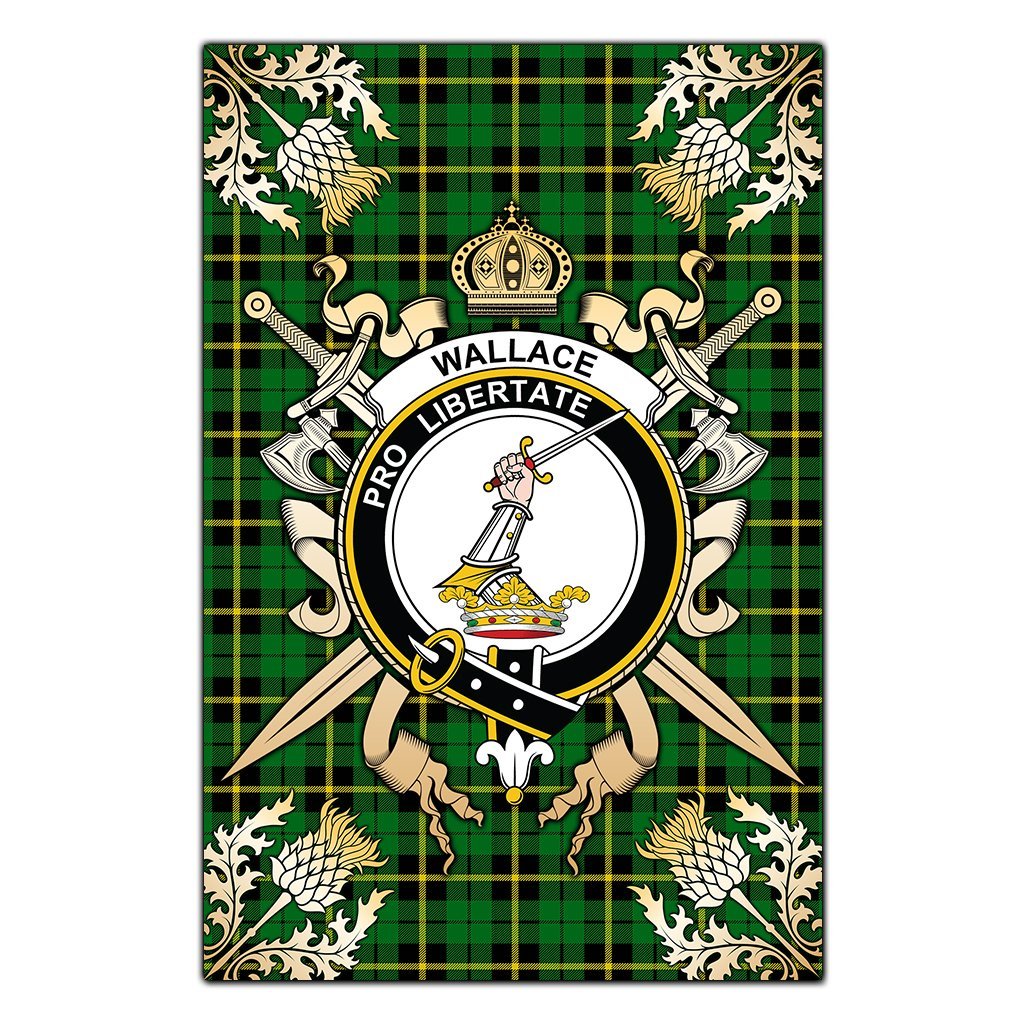 Wallace Hunting Green Tartan Crest Black Garden Flag - Gold Thistle Style